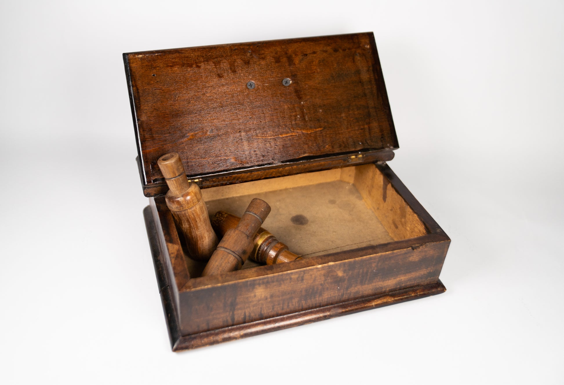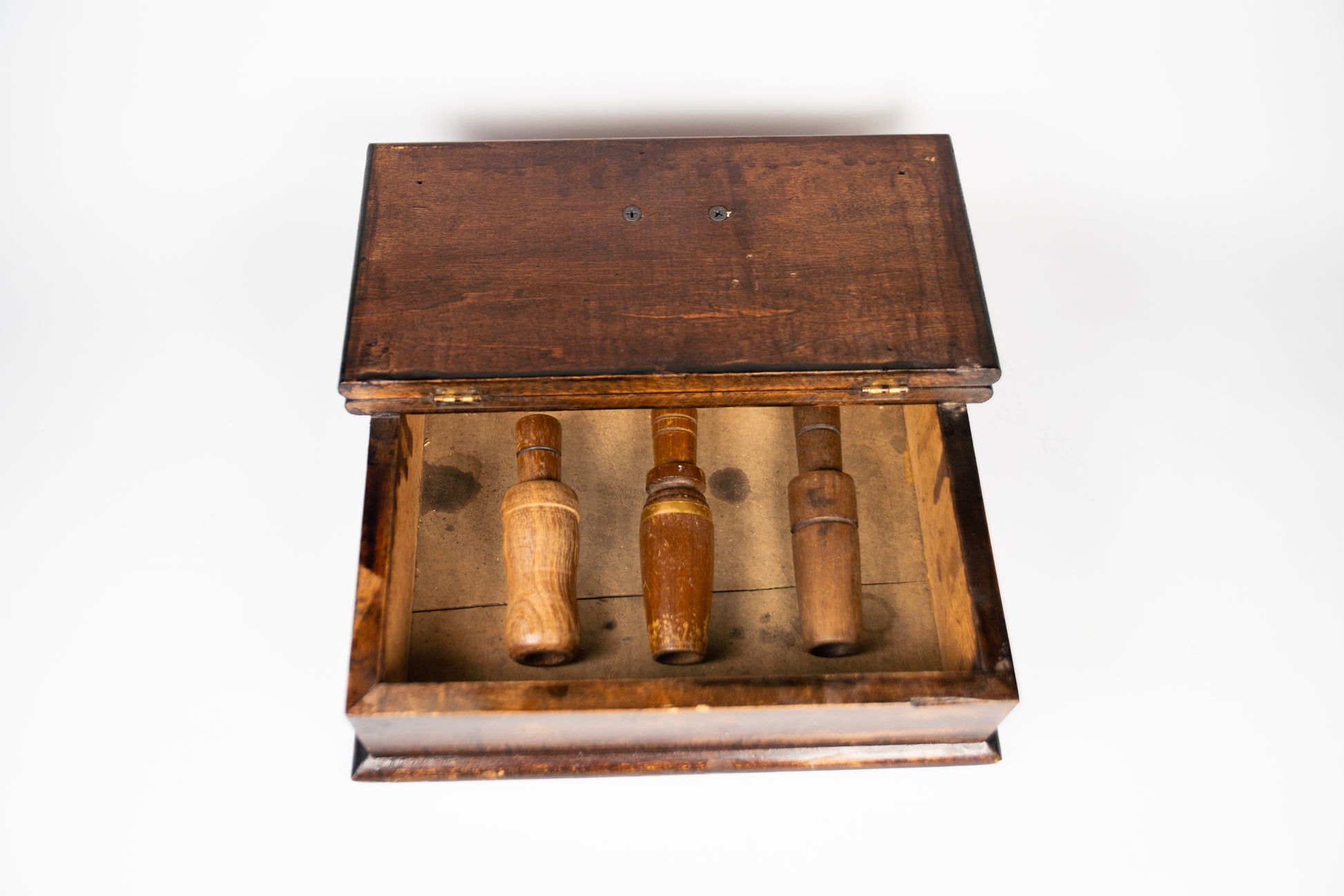 Vintage Wood Duck Call Box with 3 Wooden Duck Calls. Gold Banded Sears and Roebuck duck call. Lot #63